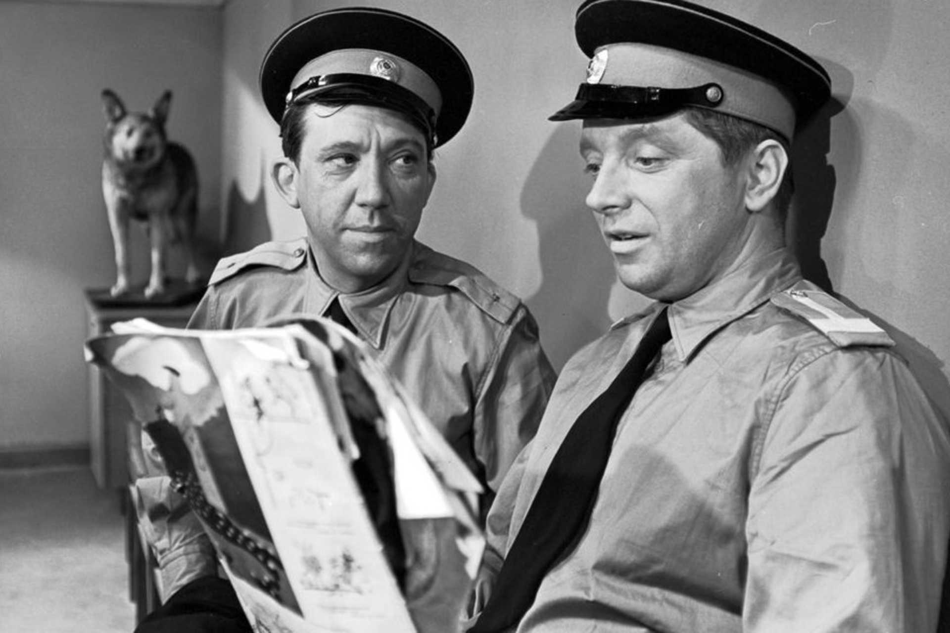 Юрий Никулин и Леонид Кмит в фильме «Ко мне, Мухтар!» (1964)