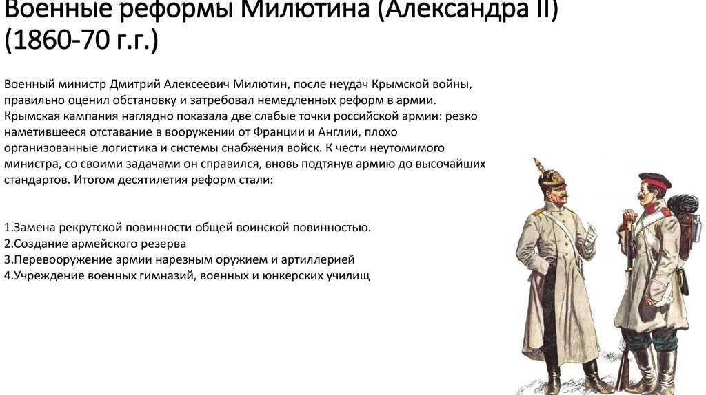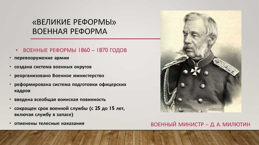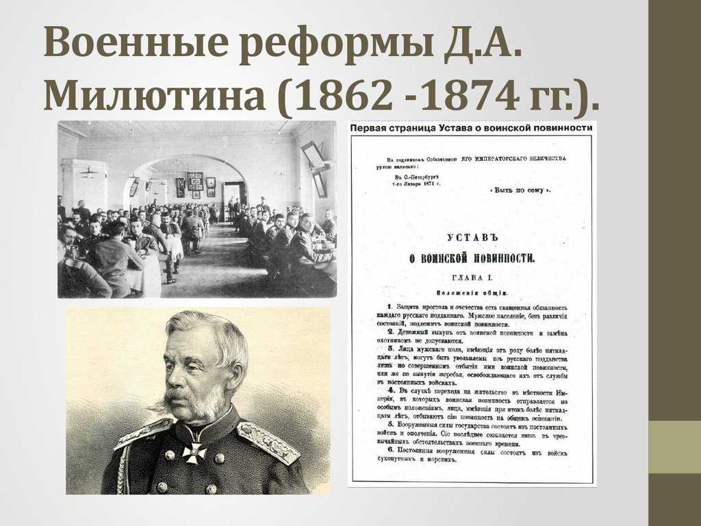 Будучи генерал-майором военного министерства во время Крымской войны, Милютин пришел к выводу, что армия нуждается в коренной реформе. Служа с 1856 по 1860 год начальником штаба Кавказского корпуса князя Александра Барятинского, Милютин оказал непосредственное влияние на успешный исход кампании против мятежного горца Шамиля. Став в ноябре 1861 г. военным министром, Милютин почти сразу представил царю Александру II доклад, в котором излагалась программа всесторонней военной реформы. Задачи заключались в модернизации армии, реорганизации военного управления в центре и создании территориальной системы военных округов для обеспечения армии в мирное время