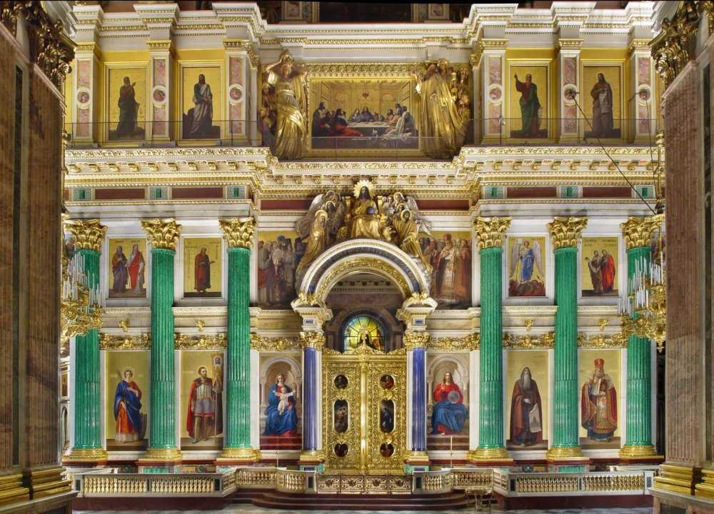 Исаакиевский собор – единственный собор, в отделке которого использовано много природного цветного камня. Камнерезные работы выполнены с величайшим мастерством. Стены и пол выложены плитами из русского, французского, итальянского мрамора. Стены облицованы белым мрамором с отделочным панно из зеленого и желтого мрамора, яшмы и порфира. При отделке использовано 16 тонн малахита, 500 кг лазурита, 400 кг золота, 1000 тонн бронзы.