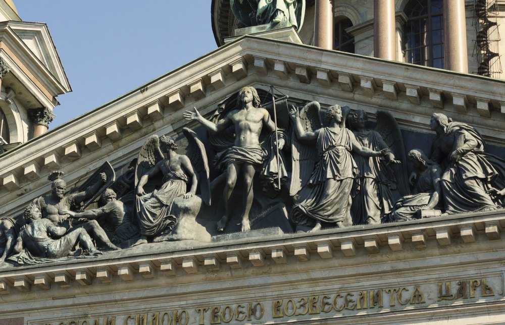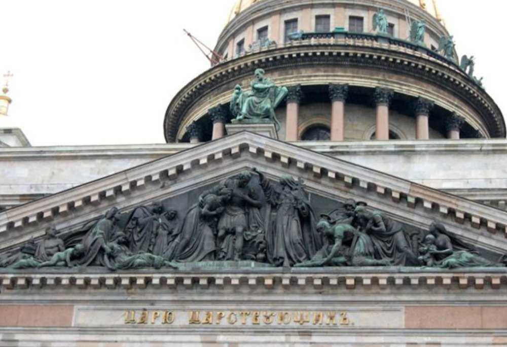 Главный колокол украшен обликом Исаакия и пятью медальонами с изображением русских государей – от Петра I до Николая I. Фасадный декор смотрится выразительно и монументально: фронтонные барельефы, статуи ангелов, оформление наружных дверей подчеркивают величие Исаакиевского собора. Каждая из архитектурных деталей храма глубоко символична. Фасады украшены неповторимыми скульптурными сюжетами.