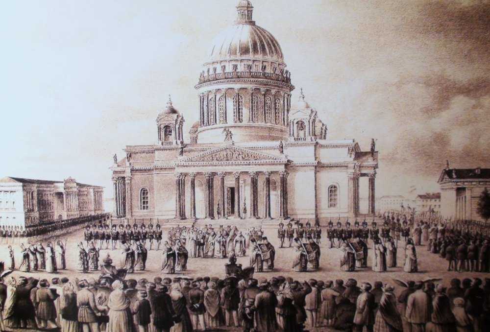 В 1809 году Александр I объявил конкурс проектов на строительство нового храма – красивого, монументального, величественного. Проект Исаакиевского собора одобрили только в 1818 году. Должность «императорского архитектора» получил француз Огюст Рикар де Монферран, который изготовил и передал Николаю I, лично курирующему строительство, 24 проекта будущей церкви. Царь одобрил план пятиглавого храма с колоннами и портиками, который строили 1818-1858 годы.