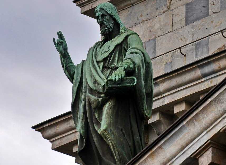 Скульптуры апостолов Андрея, Матфея, Филиппа и сцены из Нового завета украшают фасад. Андрей проповедовал учение Христа во многих странах, даже в Русской земле. Его распяли на кресте особой формы, в виде буквы Х, который с тех пор называют Андреевским. В России он считается покровителем флота. При Петре Великом учредили Андреевский флаг и Орден Святого апостола Андрея Первозванного.