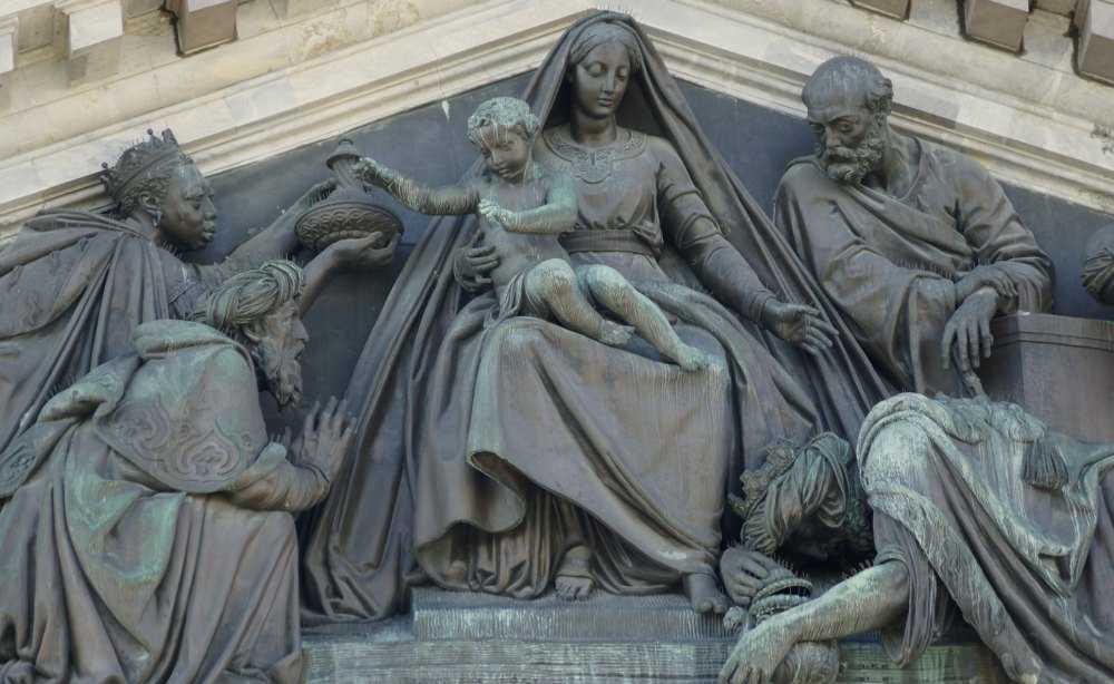 На южном фасаде – рельефная сцена «Поклонение волхвов». В центре – Мария с младенцем, сидящая на троне, ее окружают пришедшие на поклон волхвы. Справа около Марии, чуть склонив голову, стоит Иосиф. Слева – ребенок, в руках которого ларец с подношениями.
