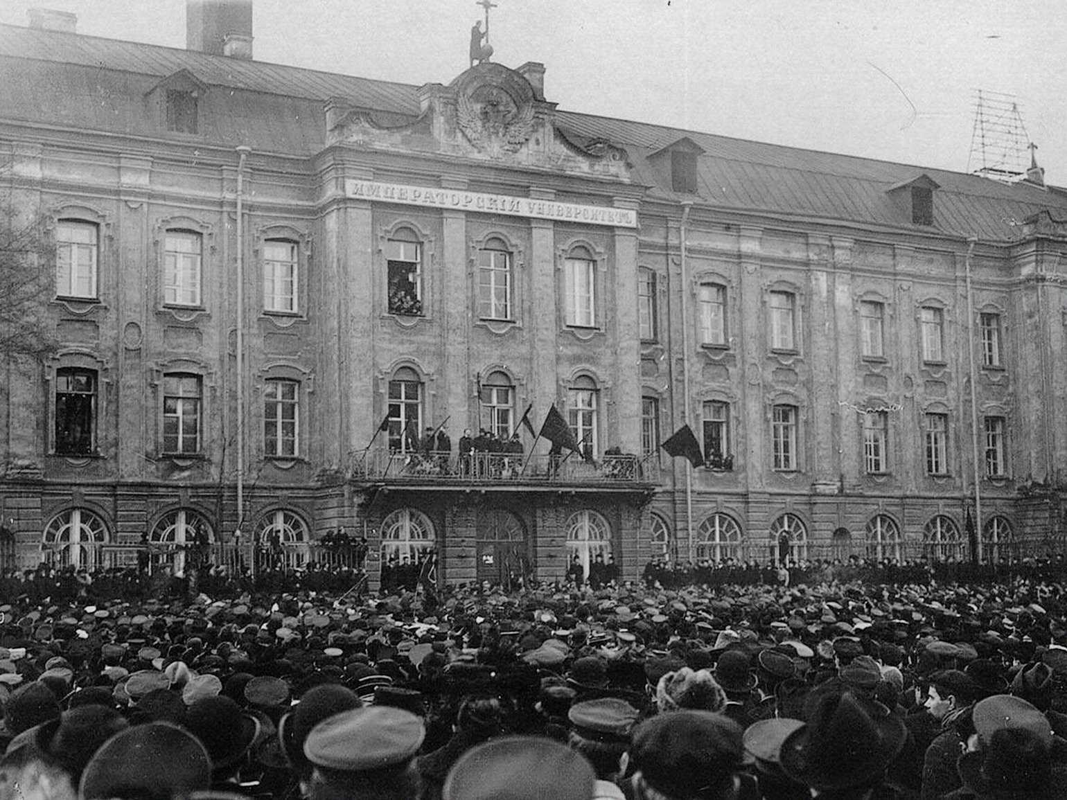 Митинг студентов около университета по случаю Высочайшего манифеста «Об усовершенствовании государственного порядка», 17 октября 1905 года, Санкт-Петербург. Фото: Центральный государственный архив кинофотофонодокументов Санкт-Петербурга / История России в фотографиях