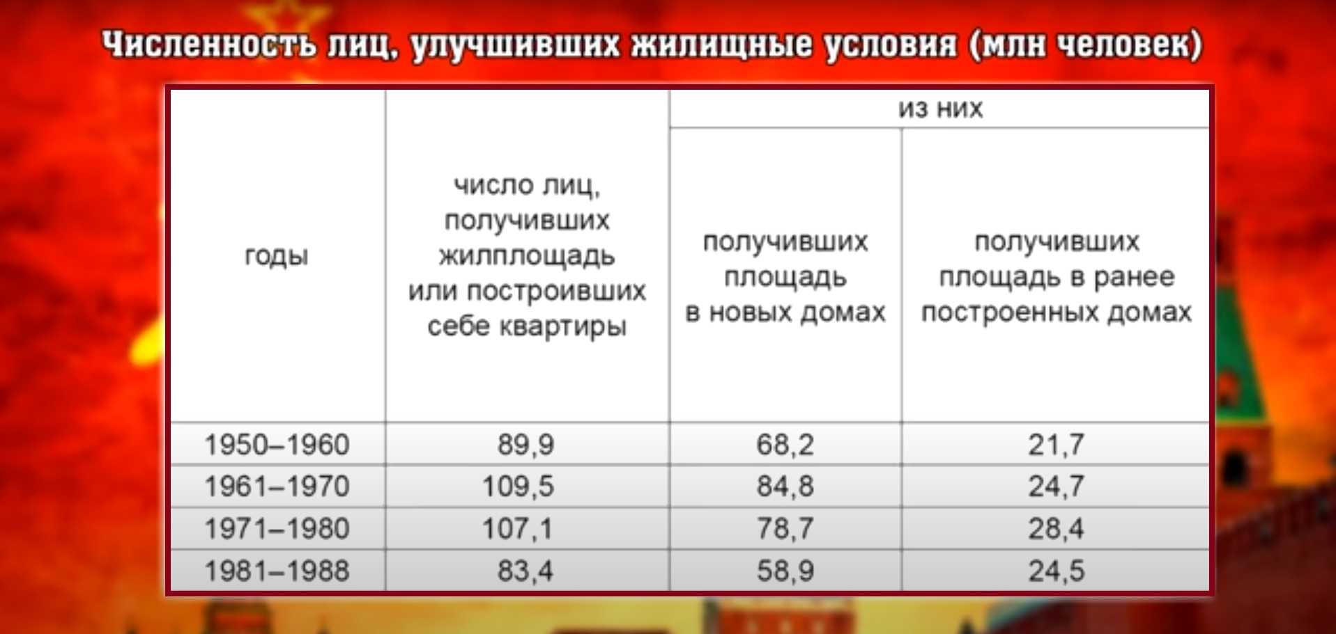 Помимо этого, за время так называемого «застоя», более двухсот миллионов советских граждан получили или приобрели жилплощадь. И в основном бесплатно или в рассрочку (не путать с ипотекой и кредитами), которая фактически не сказывалась на заработной плате!
