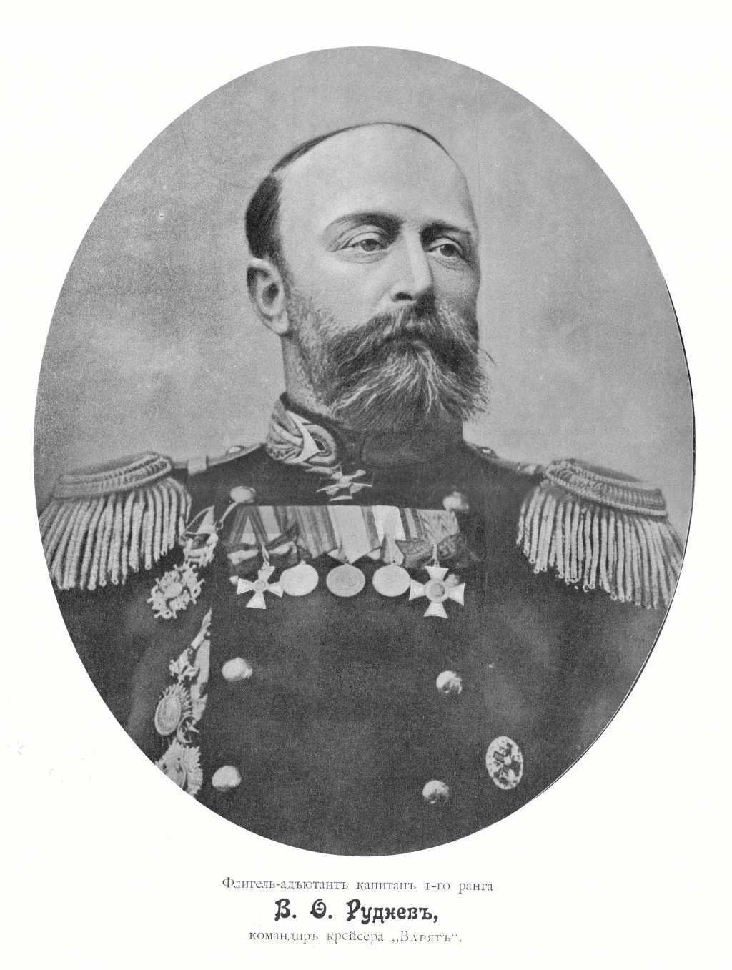 «…В 11 часов 45 минут с крейсера «Асама» был сделан первый выстрел из 8-дюймового орудия, вслед за которым вся эскадра открыла огонь.Впоследствии японцы уверяли, что адмирал сделал сигналом предложение о сдаче, на которое командир русского судна ответил пренебрежением, не подняв никакого сигнала. Действительно, мною был виден сигнал, но я не нашел нужным отвечать на него, раз уже решил идти в бой.После чего, произведя пристрелку, открыли огонь по «Асама» с расстояния 45 кабельтов. Один из первых снарядов японцев, попав в крейсер, разрушил верхний мостик, произведя пожар в штурманской рубке, и перебил фок-ванты, причем были убиты далъномерный офицер мичман граф Нирод и все дальномерщики станции №1 (no окончании боя найдена одна рука графа Нирода, державшая дальномер)……Убедившись после осмотра крейсера в полной невозможности вступить в бой и не желая дать неприятелю возможность одержать победу над полуразрушенным крейсером, общим собранием офицеров решили потопить крейсер, свезя раненых и оставшуюся команду на иностранные суда, на что последние изъявили полное согласие вследствие моей просьбы……Ходатайство о награждении офицеров и команды за их беззаветную храбрость и доблестное исполнение долга представляю особо. По сведениям, полученным в Шанхае, японцы понесли большие потери в людях и имели аварии на судах, особенно пострадал крейсер «Асама», который ушел в док. Также пострадал крейсер «Такачихо», получивший пробоину; крейсер взял 200 раненых и пошел в Сасебо, но дорогой лопнул пластырь и не выдержали переборки, так что крейсер «Такачихо» затонул в море. Миноносец затонул во время боя.Донося о вышеизложенном, считаю долгом доложить, что суда вверенного мне отряда с достоинством поддержали честь Российского флага, исчерпали все средства к прорыву, не дали возможности японцам одержать победу, нанесли много убытков неприятелю и спасли оставшуюся команду.Подписал: командир крейсера 1 ранга «Варяг» капитан 1 ранга Руднев6 февраля 1904 г.»