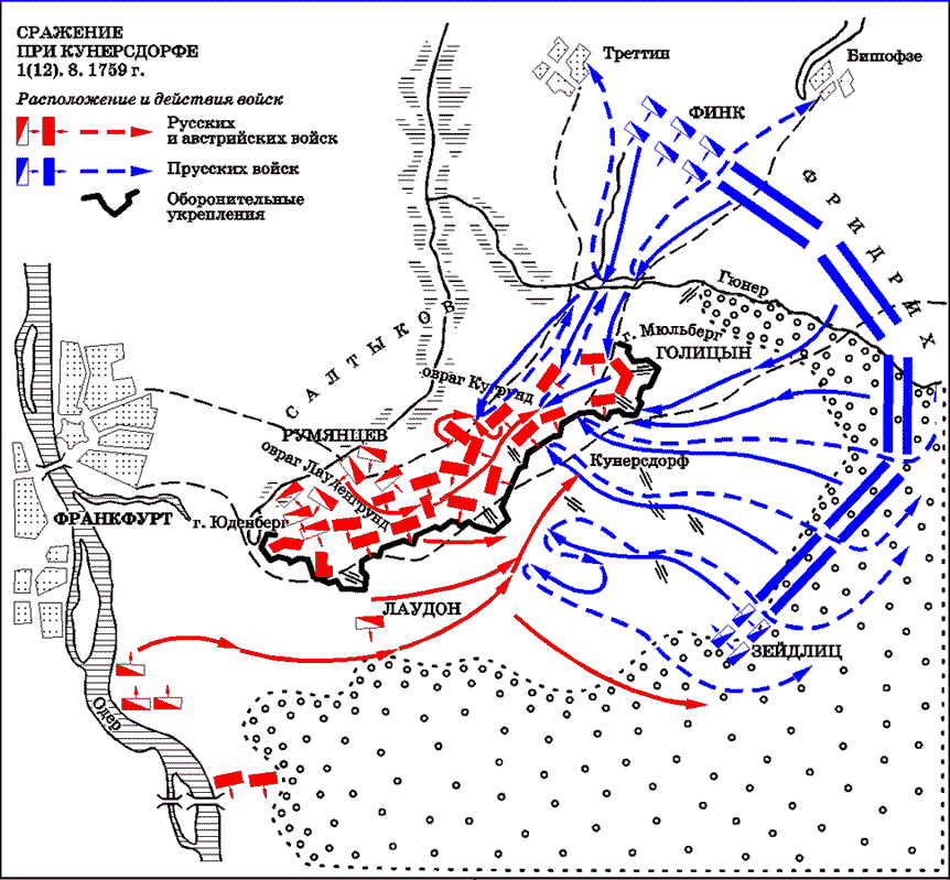 Тогда русская армия во главе с П.С. Салтыковым одержала многочисленные победы. Генерала Салтыкова, как и Суворова, уважали в армии. Самое крупное сражение произошло в 1759 году. Битва завершилась победой России. Причины победы заключались в хорошем маневре П.С. Салтыкова всеми частями армии, слаженной работе русской и австрийской армий.