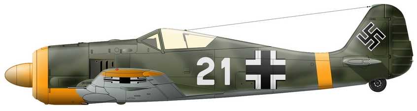 Fw 190A-3 (предположительно, W.Nr. 5345) из состава 15.(Span.)/JG 51. По принятой в эскадрилье практике назначения бортовых номеров, он должен был принадлежать 3-му патрулю, но осенью 1943 года на нём летал лётчик 1-го патруля тененте Фернандо Санчес-Архона-и-Коуртой (Fernando Sánchez-Arjona y Courtoy), который с июля по сентябрь одержал девять подтверждённых побед. Лётчик погиб 19 ноября в авиакатастрофе при выполнении боевого вылета в плохих метеоусловиях. Самолёт показан в камуфляже с использованием двух зелёных красок (RLM 71 Dunkelgrün и RLM 70 Schwarzgrün)