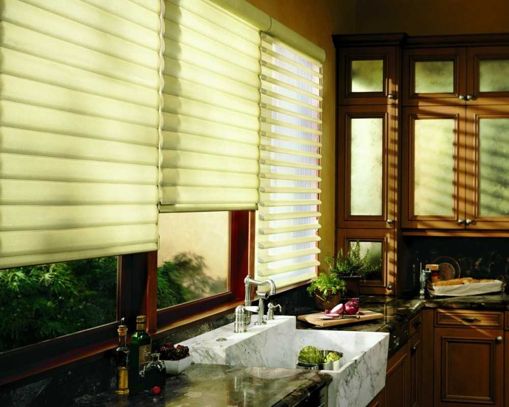 На кухню можно повесить рулонные шторы песочных оттенков.