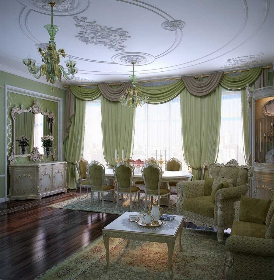 Это многофункционально пространство, поэтому неудивительно, что здесь предпочитают использовать греко-римские занавески, иногда прибегают к помощи рулонных штор. В приоритете светлая палитра: пастель, беж, песочные оттенки. Кухня, пожалуй, единственное помещение, которое «смирится» с отсутствием геометрии в греческих занавесках, также допускаются растительные орнаменты.
