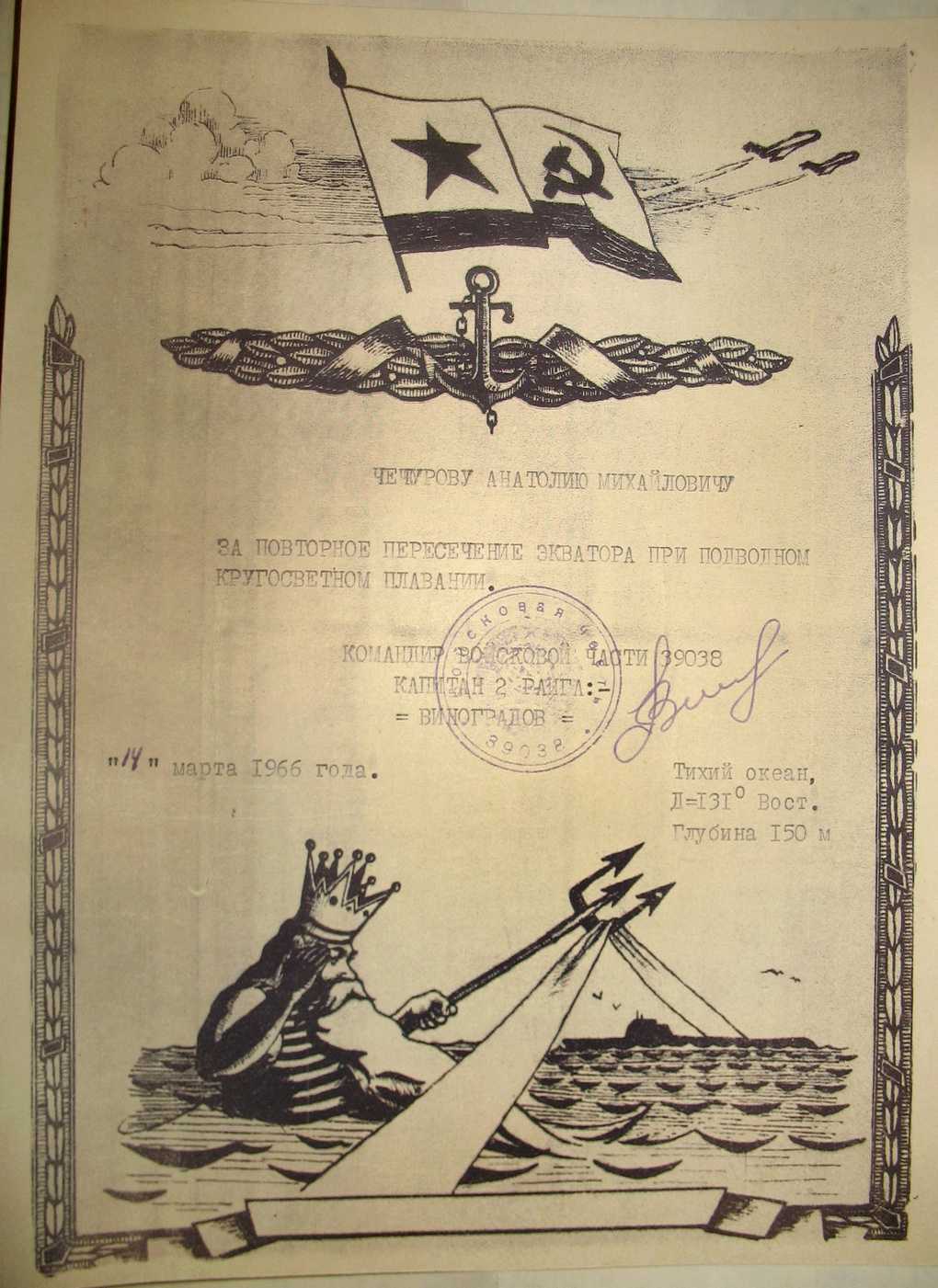 — Храню в домашнем архиве несколько «нептуновских дипломов» и грамот, которые мне выдали на борту К-116 по случаю праздников. Но главная реликвия — это, конечно, карта нашего похода. В первый же день автономного плавания моряки повесили ее в одном из отсеков атомохода и потом регулярно отмечали пройденный путь. Когда лодка пришвартовалась на камчатской базе и все члены экипажа и прикомандированные сходили на берег, гляжу — а карта висит на переборке, всеми забытая! Снял ее и прихватил с собой. Естественно, понимал, что документ секретный, и потому практически никому не показывал, кроме своего институтского начальства. Ну а теперь те, уже более полувековой давности военные тайны всем известны. Так что можно карту демонстрировать публично.