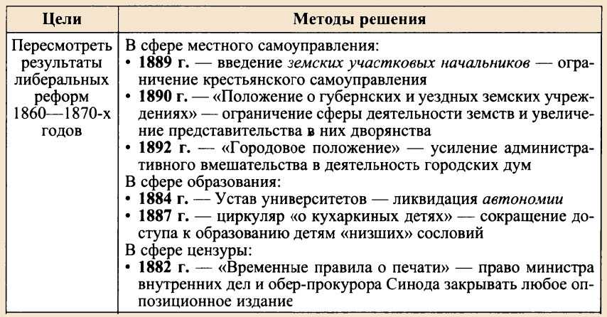 В 1884 году была проведена университетская реформа. Она фактически отменила самоуправление высших учебных заведений. Усиливалась роль духовенства в образовании. Следующим шагом в сфере образования стал циркуляр «О сокращении гимназического образования» 1887 года, который современники называли «циркуляр о кухаркиных детях» от министра просвещения Делянова.