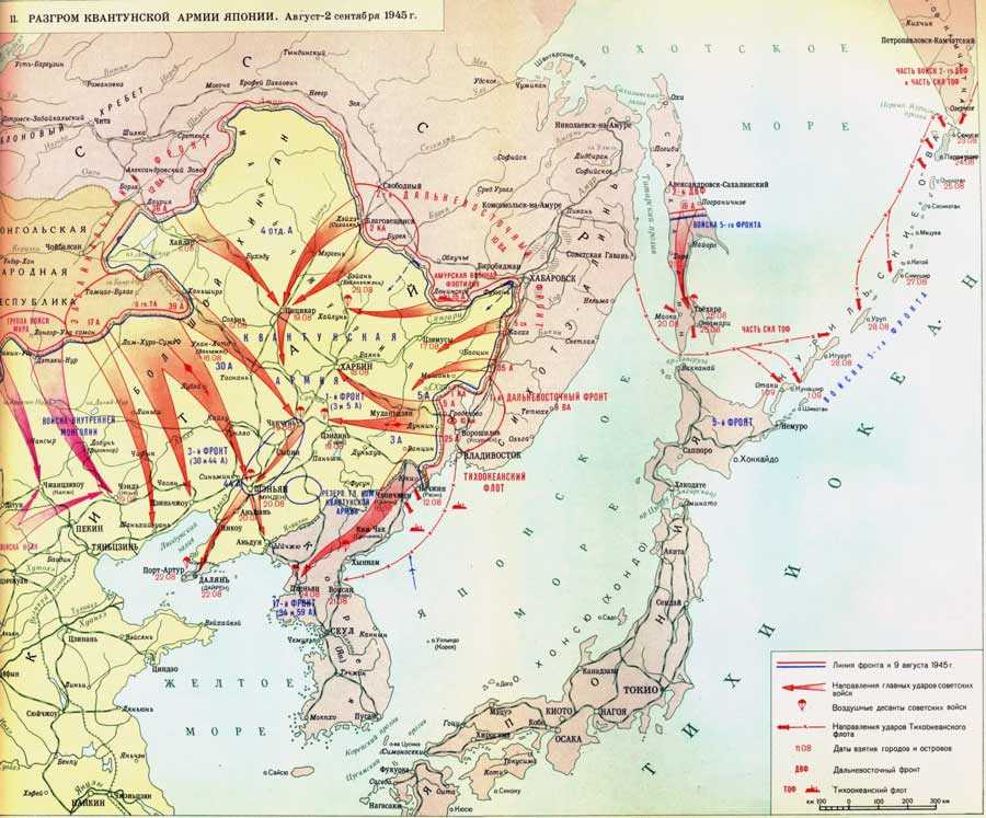 8 августа японскому послу в Москве сообщили, что в связи с отказом Японии прекратить военные действия против союзников Советский Союз со следующего дня считает себя в состоянии войны с Японией. А в 10 минут первого ночи 9 августа передовые отряды советских войск, без артподготовки и бомбардировки, начали наступление. По расчетам японского генштаба, советские войска должны были потратить на прорыв маньчжурской укрепленной линии не менее полугода. Но советские солдаты и офицеры опровергли все эти расчеты. Темпы наступления войск Красной Армии составляли 20-60 км в сутки, а на главных направлениях — от 30 до 80 км. Доходило до того, что горючее для вырвавшихся далеко вперед танковых колонн приходилось забрасывать транспортными самолетами.