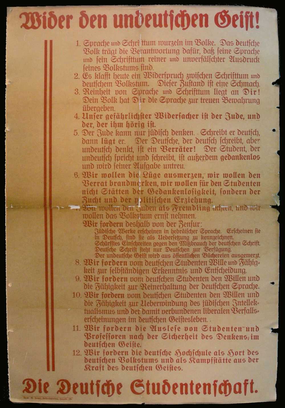 Во всех университетах были расклеены «12 тезисов против негерманского духа», напечатанные крупным красным готическим шрифтом: